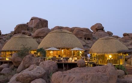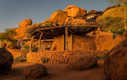 Located within close proximity to the Aba-Huab River, Camp Kipwe is a small and intimate bush lodge located in Namibia’s arid yet starkly beautiful Twyfelfontein region. Camp Kipwe is full of surprises, starting when guests first arrive. It appears as if rocks have tumbled down the hill to reveal this gem of a camp. The setting is one of intimacy and space. An inviting lounge area, where birds fly in to enjoy the water seeping from the rocks, a refreshing swimming pool nestled in the rocks and a scattering of bungalows complete this eco friendly camp.