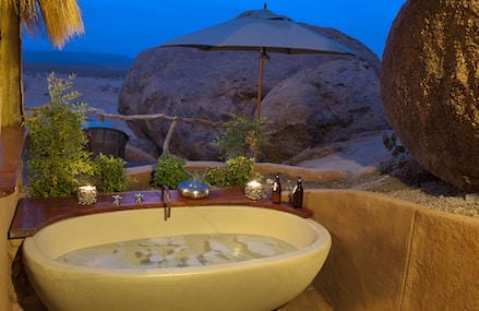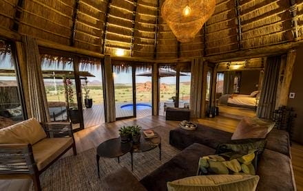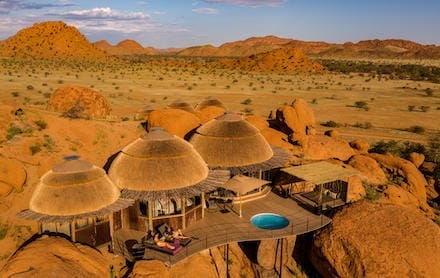 The Luxury Suites sit atop of the rocky outcrop and feature a large lounge with separate air-conditioned bedroom, and en-suite bathroom before spilling out on to a large deck with spectacular, uninterrupted views across the Damaraland landscape. Equipped with Wi-Fi, a stocked minibar, heated splash pool and private salas to soak up the vistas.