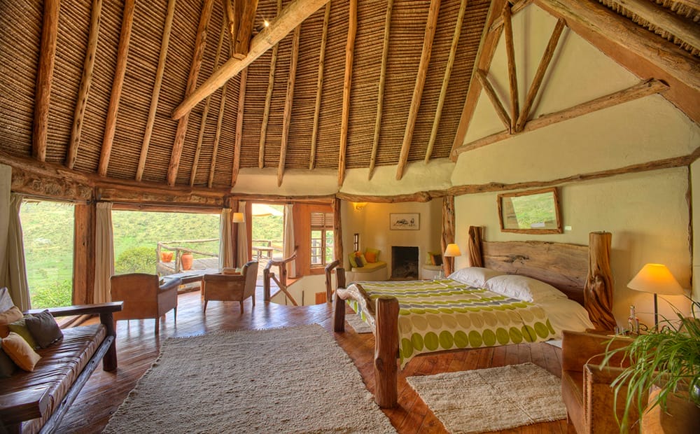 In the dining room at the main lodge guests can sample fresh produce from the Ranch, fresh juice from the Borana orchard and wines from around the world. In the sitting room, sofas and armchairs surround a huge open fireplace and picture windows guarantee a continuing vista to the plains below.