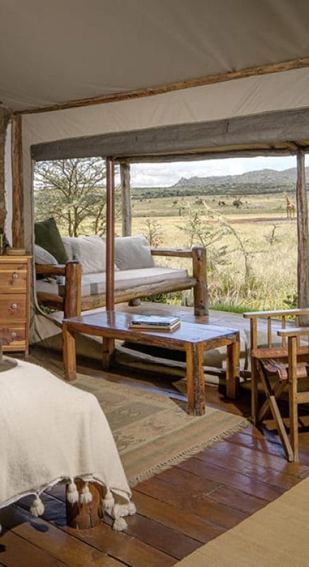 The lounge area is the heart of the camp, with cosy armchairs to sink in and watch the wildlife roam past, a large deck, dining area and fireplace for cooler evenings. There are family photos here telling the story of real life at Enasoit, and its history. And a collection of books about African wildlife and history to read by the campfire. There’s a waterhole and salt-lick in view of the deck, lit at night, providing endless live entertainment!
