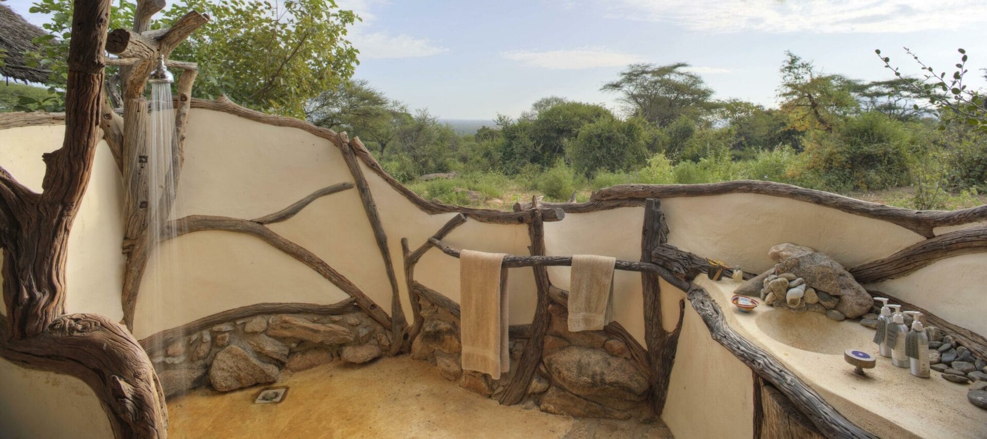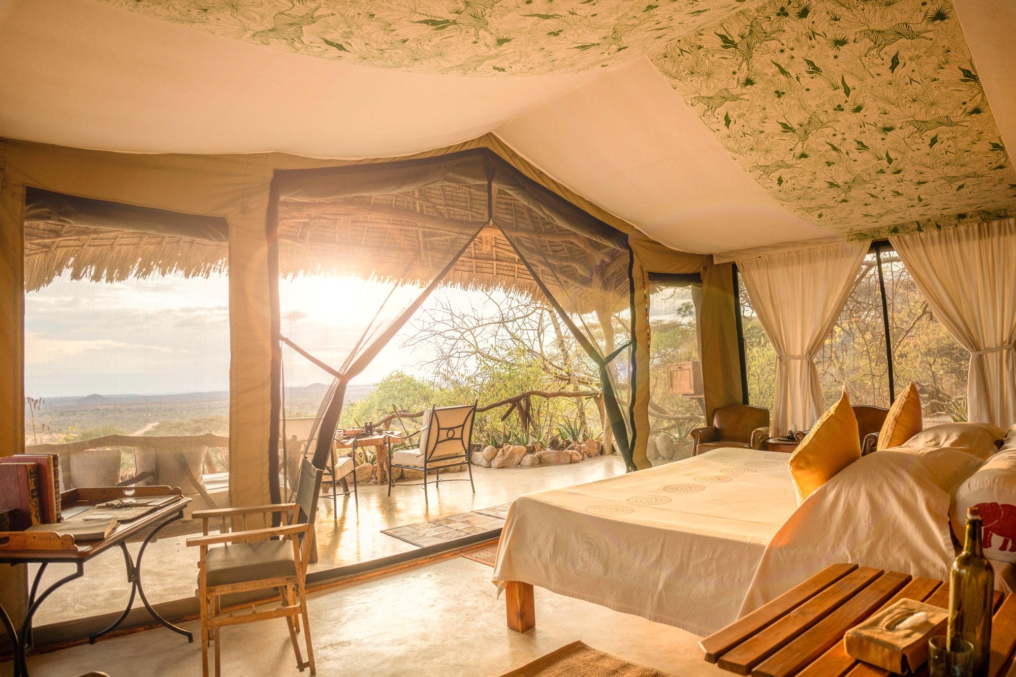 Sarara Camp consists of just five spacious tents, 2 doubles and 3 twins, each with flush lavatories and open air showers. A natural rock swimming pool overlooks a wildlife waterhole frequently visited. Gas lamps provide lighting in each tent and a 12V battery is available to re-charge camera batteries on request.