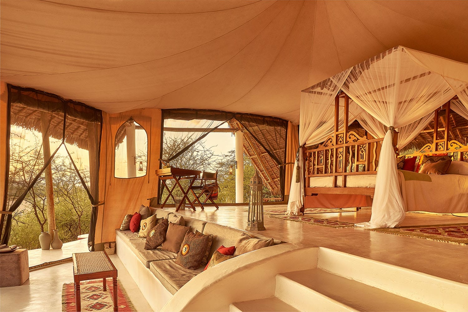 Sasaab accommodates up to 18 guests in nine individually located tents with magnificent views of the river and the true African wilderness, each over 100 square meters. There is wireless internet and own plunge pool and privacy. Electricity is solar powered, offering outlets for charging equipment in each tent. The uniquely designed tents are ideal for game viewing and bird-watching as well as relaxing.