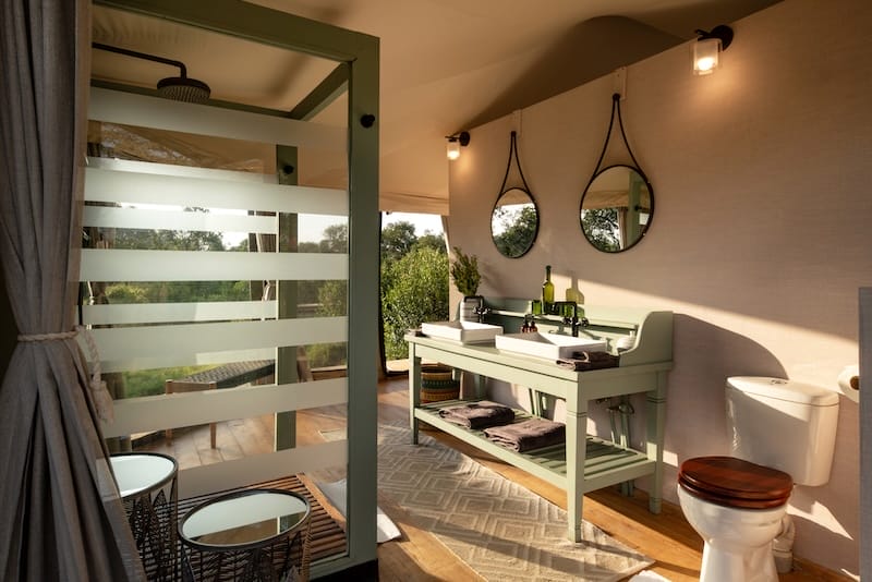 Six ensuite tents and a two-bedroom family tent sit along the Ngobit River, each with a private deck, daybeds, and indoor/outdoor showers for a seamless bush-living experience.