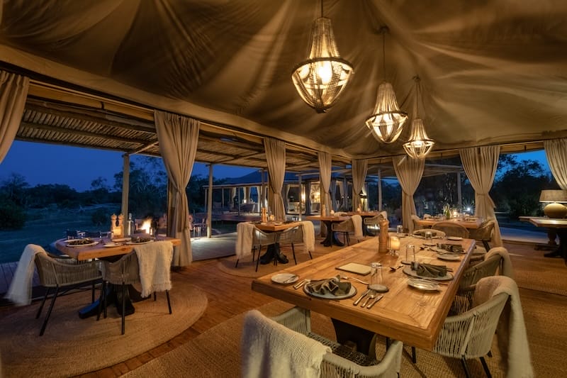 Accommodation includes six spacious ensuite tents and a two-bedroom family tent, each with a private deck overlooking the river and a nearby watering hole. With indoor and outdoor showers, plush daybeds, and contemporary comforts, the design balances rustic charm with understated luxury. Guests can also enjoy the camp’s infinity pool, library, dining tent, al fresco deck, and spa treatments that capture the spirit of relaxation.