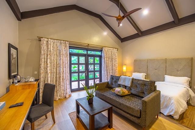 Located in the grounds of the beautifully-kept gardens and the inviting pool, are 13 stone chalets and one deluxe cottage. All are very well appointed, with Self-contained bathrooms with hot water shower, Hair dryer, Flat screen TVs (all satellite channels), Mini bar, Laundry services (including dry-cleaning upon request), Security features (smoke detectors), All rooms are non-smoking rooms. The Family Suite boasts two large bedrooms, both en suite, and a shared lounge. And the VIP Cottage also has two big en-suite bedrooms, together with a living area that includes a dining table for a maximum of six persons. The décor throughout is chic yet homely, and all accommodation is set in the garden grounds. The stone cottages each have an outdoor seating with views out onto the surrounding volcanoes mountain range.