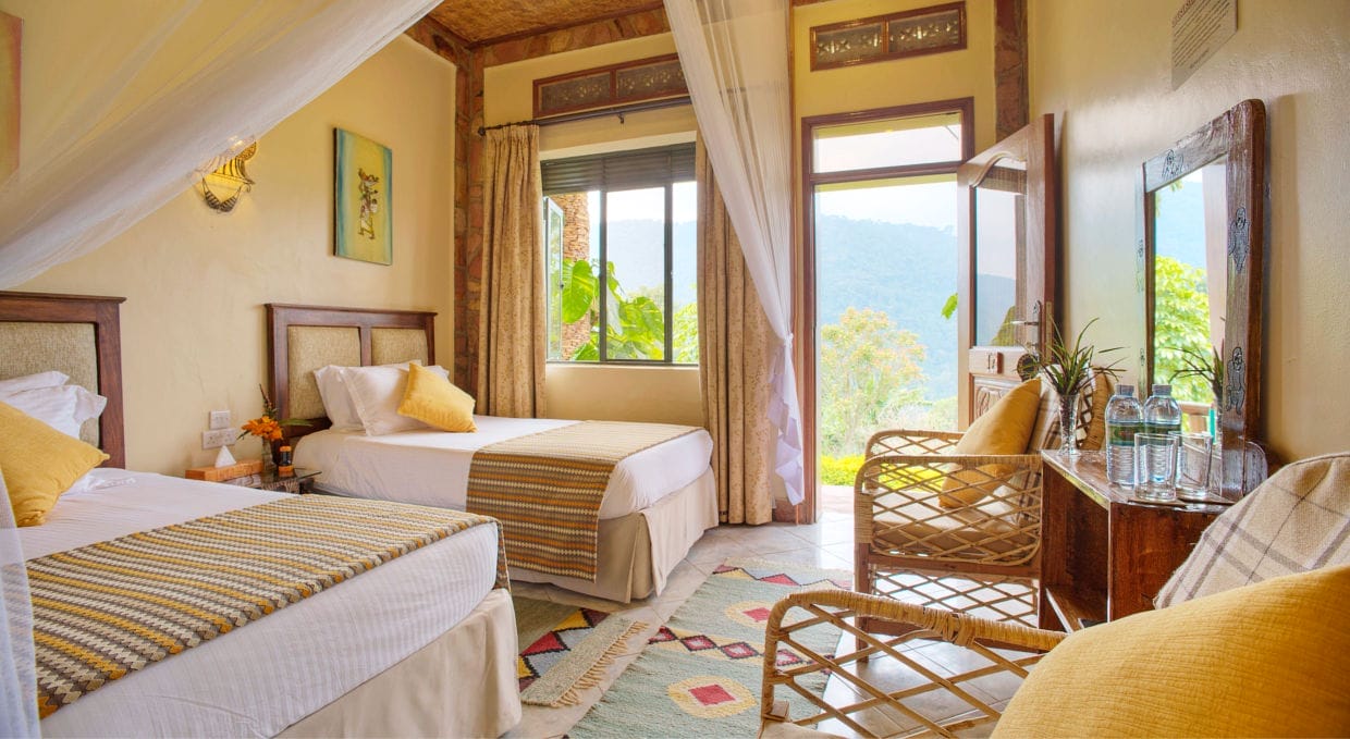 Silverback Lodge is perched on high, atop the valley overlooking Bwindi Impenetrable National Park. The view is absolutely stunning and the best place to enjoy après-tracking cocktails. Bird watching and sometimes primate viewing is possible right from the front door of your room.