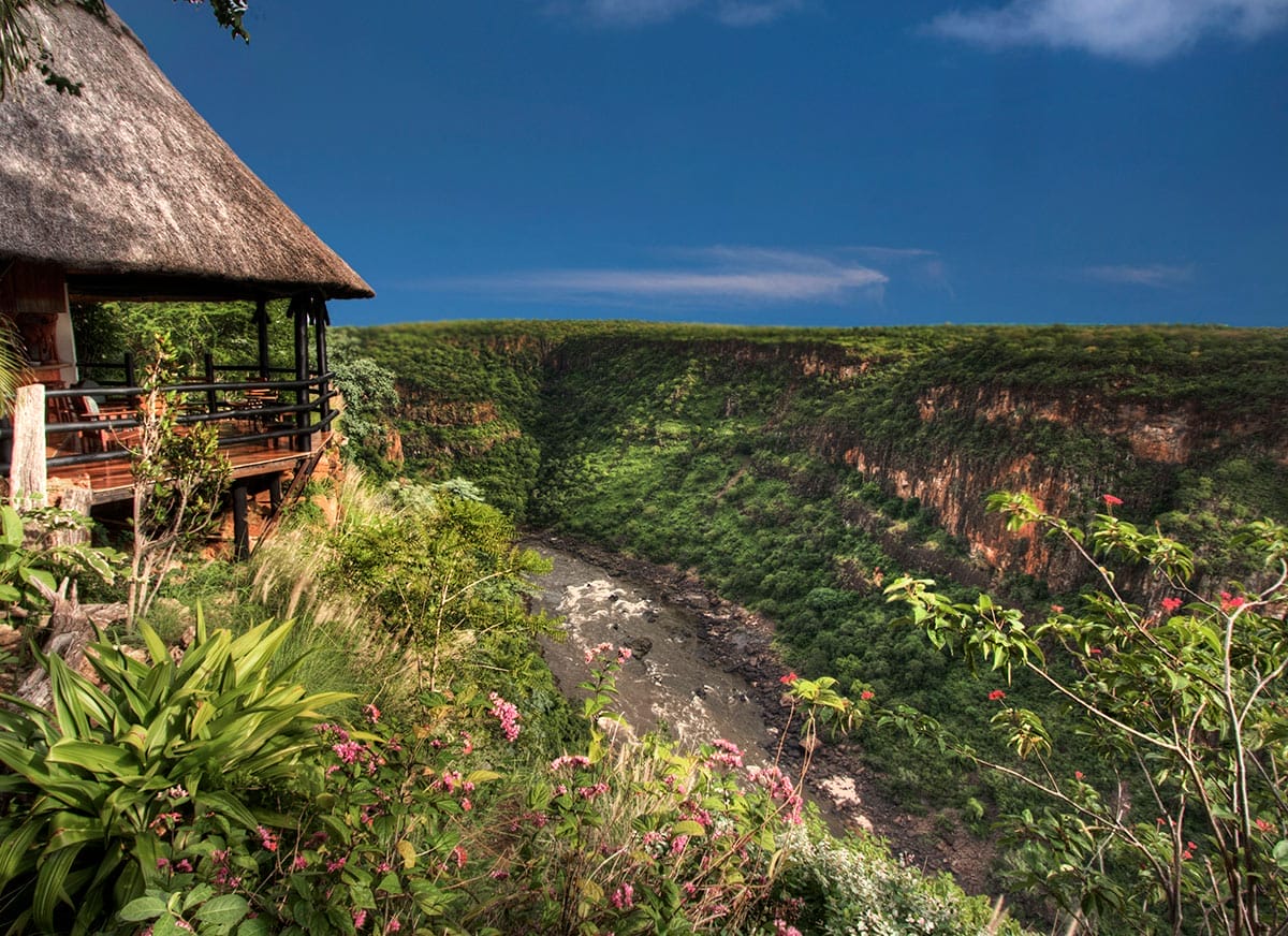 The main lodge is built on a raised deck of indigenous hardwood and has a lounge, dining room and bar that all offer extraordinary views over the gorge into Zambia.