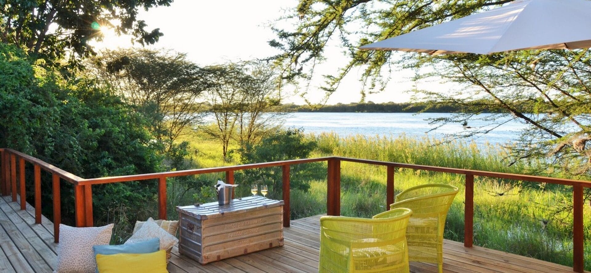 Each chalet site has been selected for its river view and is surrounded by indigenous riverine bush. Built around both ecological and traditional African principles, each chalet offers laid-back luxury with its own raised deck overlooking the river and built-in daybeds offering ample opportunity to absorb the changing moods of the Chobe. Each chalet has an interior bathroom opening onto an outside garden with an outside shower.